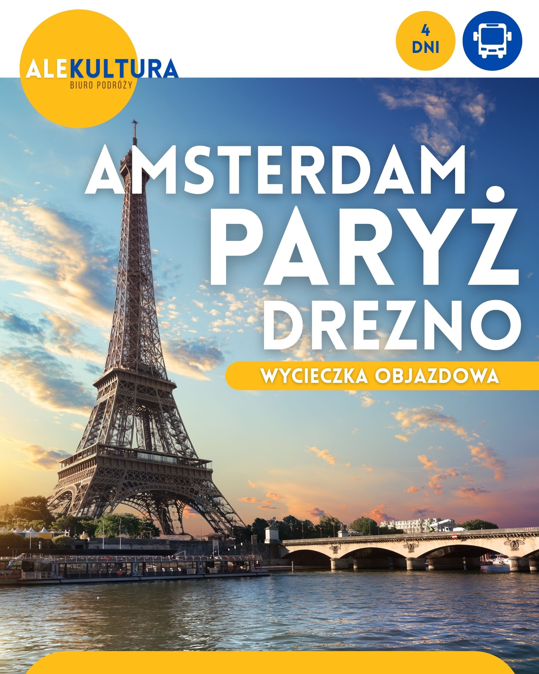 Zapraszamy na intensywną i pełną wrażeń wycieczkę objazdową, podczas której odwiedzimy trzy wyjątkowe europejskie miasta. Program łączy nowoczesny Amsterdam, romantyczny Paryż oraz historyczne Drezno, tworząc idealną propozycję dla miłośników zwiedzania i aktywnego podróżowania.